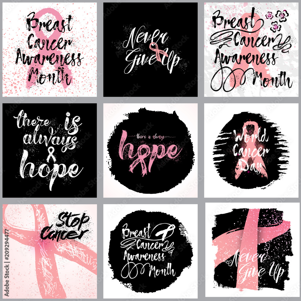 Breast Cancer Awareness Ribbon Background Set Set Of Pink Ribbon And Calligraphy Breast Cancer Awareness Quotes Cards Badges In Pink Breast Cancer Month In October Posters And Flyers Vector Stock Vector